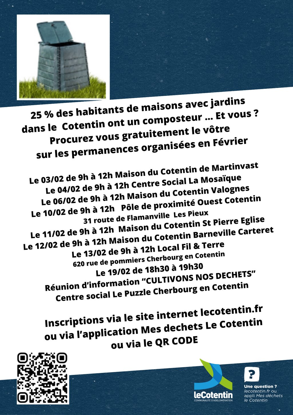 Pour rappel le retrait des composteurs ne peut se faire sans inscription préalable via le site internet lecotentin.fr ou via l'application Mes déchets - le Cotentin.