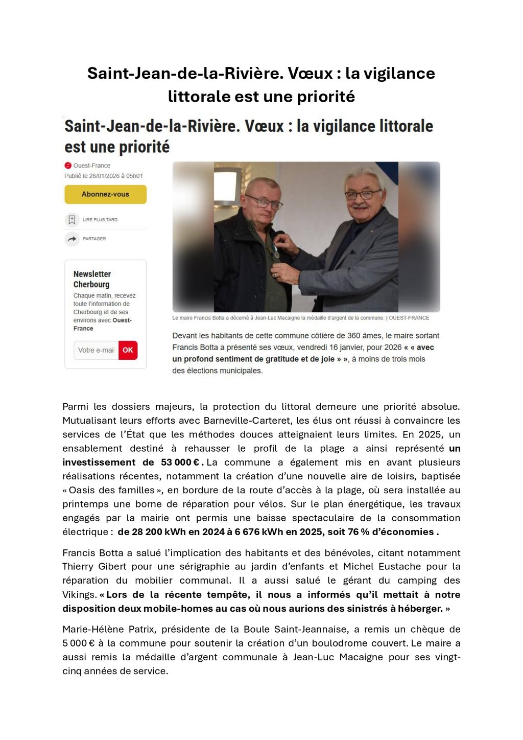 Ouest France - 26/01/2026 - Vœux : la vigilance littorale est une priorité