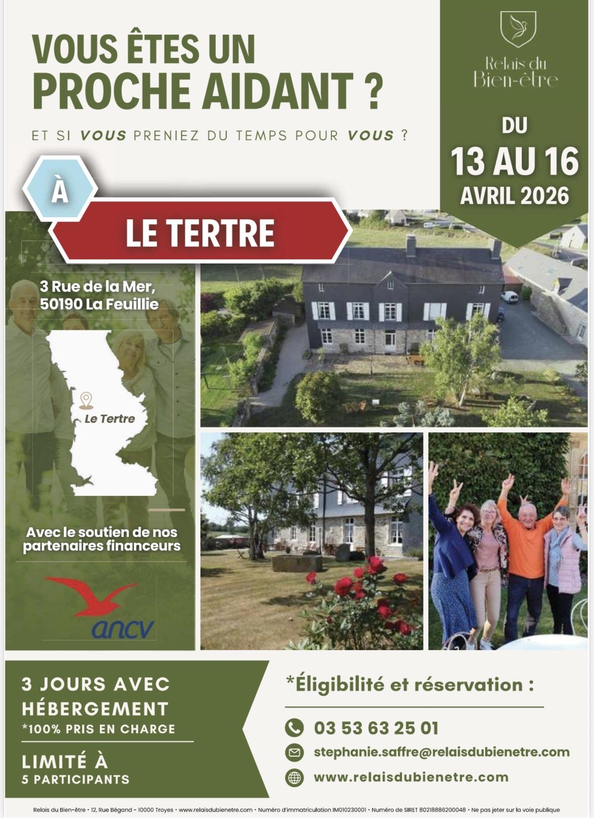 - Le Relais du bien-être propose un séjour de répit pour les aidants, pendant 3 jours au Tertre, du 13 au 16 avril