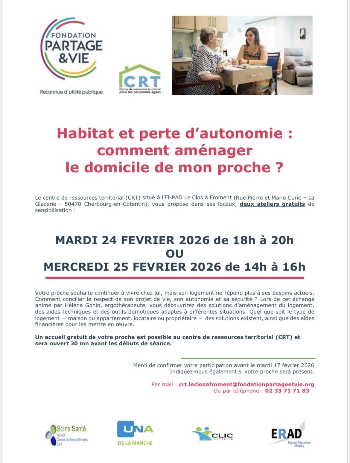 - « Comment aménager le domicile de mon proche en perte d’autonomie » 2 ateliers gratuits de 2h sont proposés par un ergothérapeute le 24 février à 18h ou le 25 février à 14h, au clos à Froment