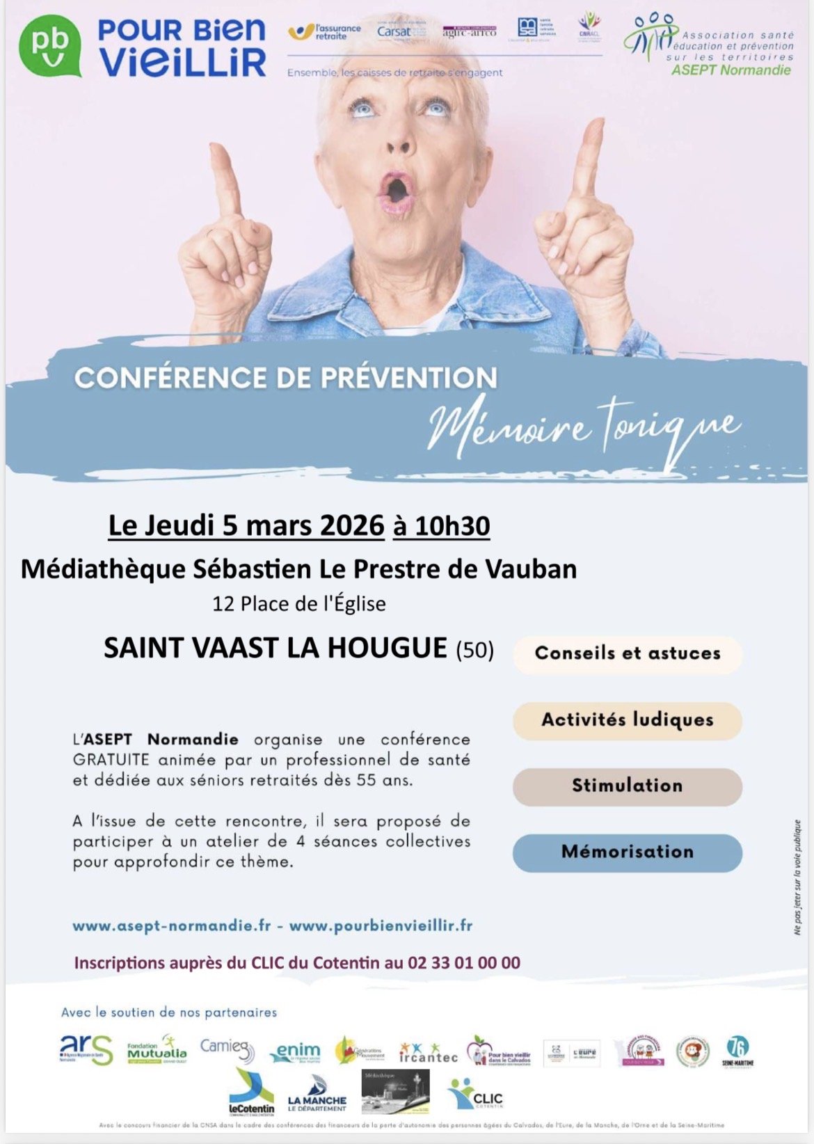 - Le jeudi 5 mars à 10h30, conférence « mémoire tonique » avec l’ASEPT Normandie et la médiathèque de Saint-Vaast-la-Hougue. Des questions sur la mémoire, son fonctionnement, son entretien… Cette conférence sera suivie de 4 ateliers sur inscription le jour même.