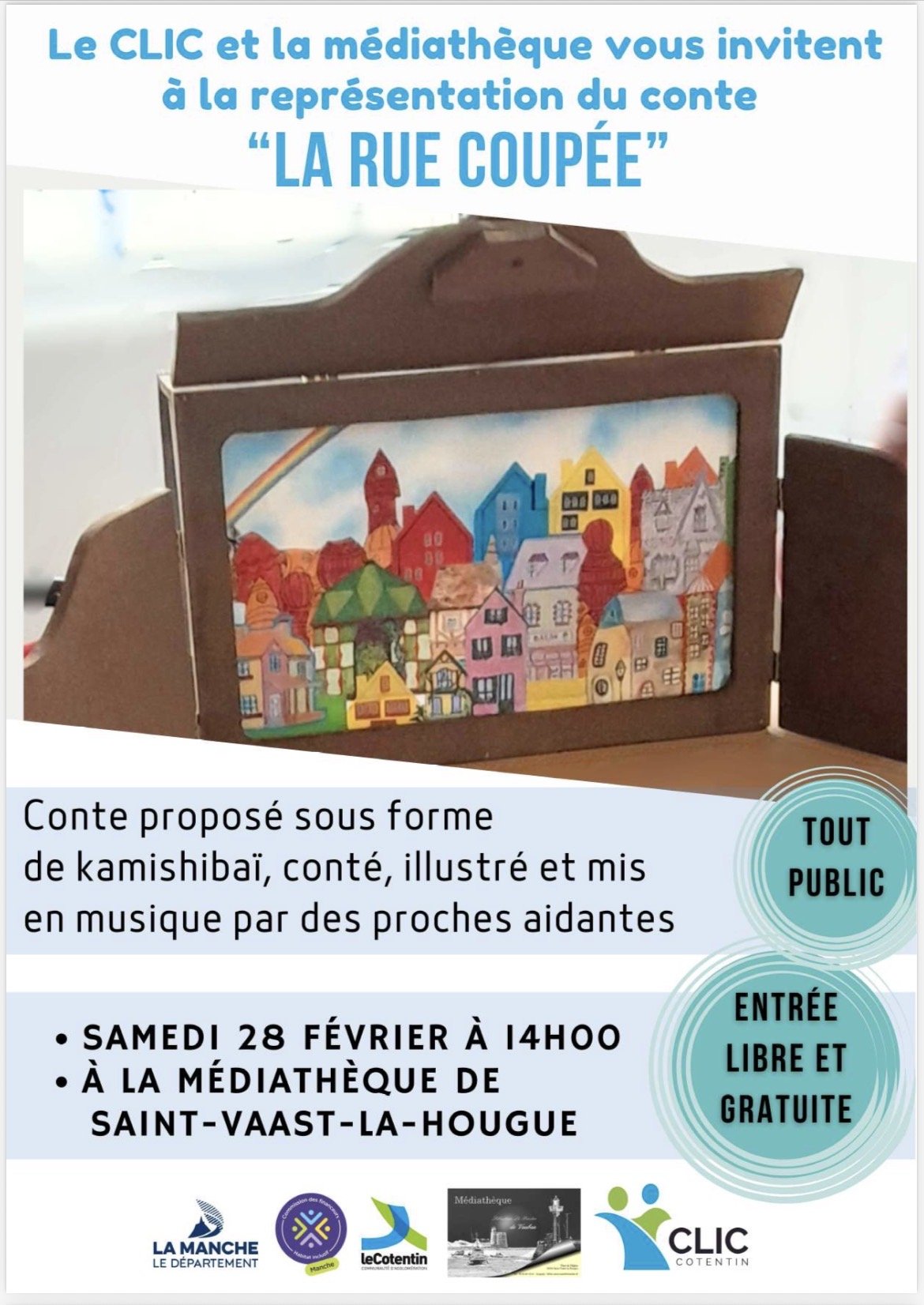 - Samedi 28 février à 14h, représentation du conte « la rue coupée » par les aidantes qui en ont fait un kamishibaï, à la médiathèque de Saint-Vaast-la-Hougue.
