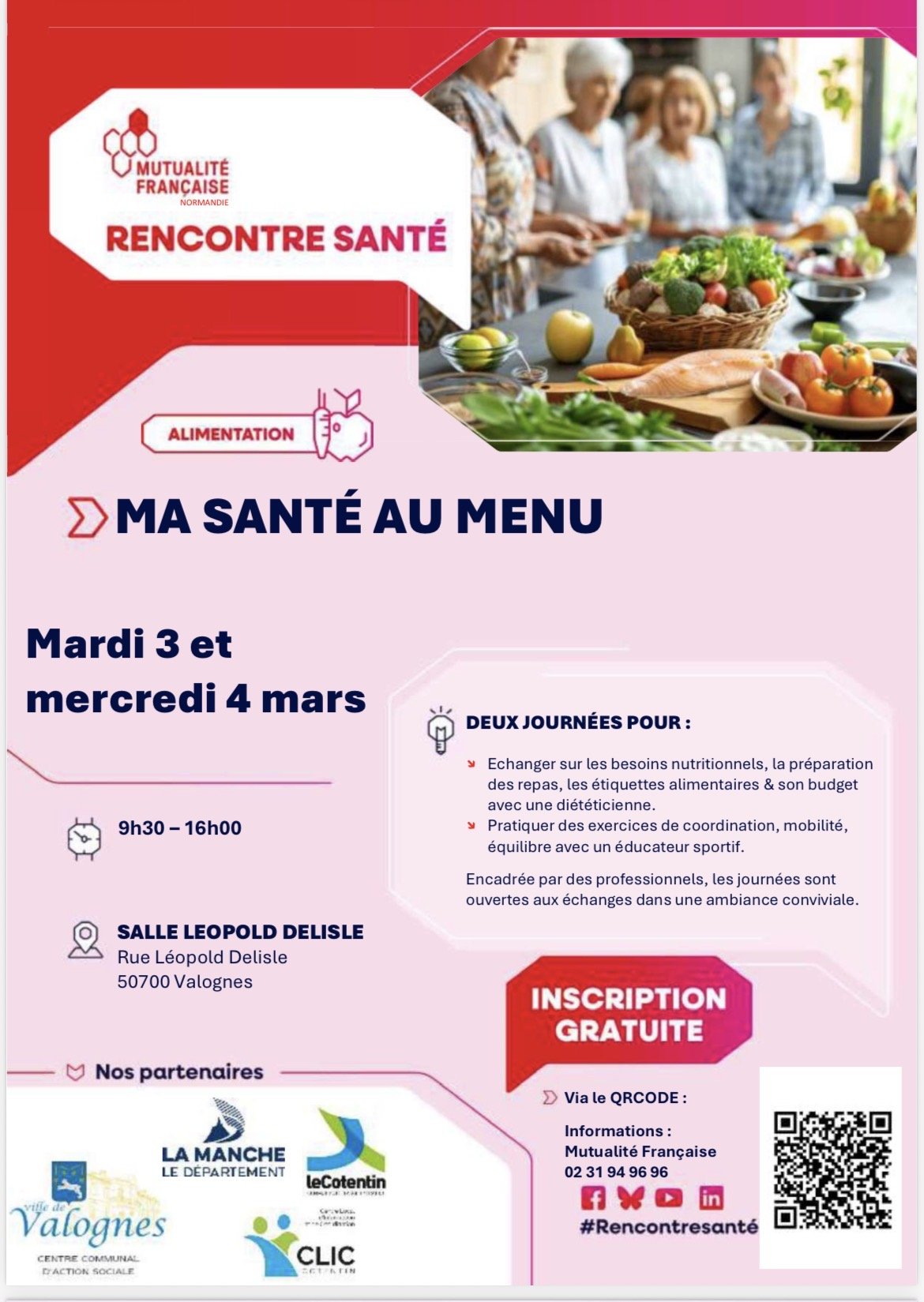 - Les 3 et 4 mars, de 9h30 à 16h00, deux journées à Valognes, salle Delisle, pour mettre « Ma santé au menu » avec la Mutualité Française Normandie : alimentation (besoins, préparation, étiquettes, budget…) et activité physique (coordination, mobilité, équilibre) seront au menu de ces 2 journées complètes.