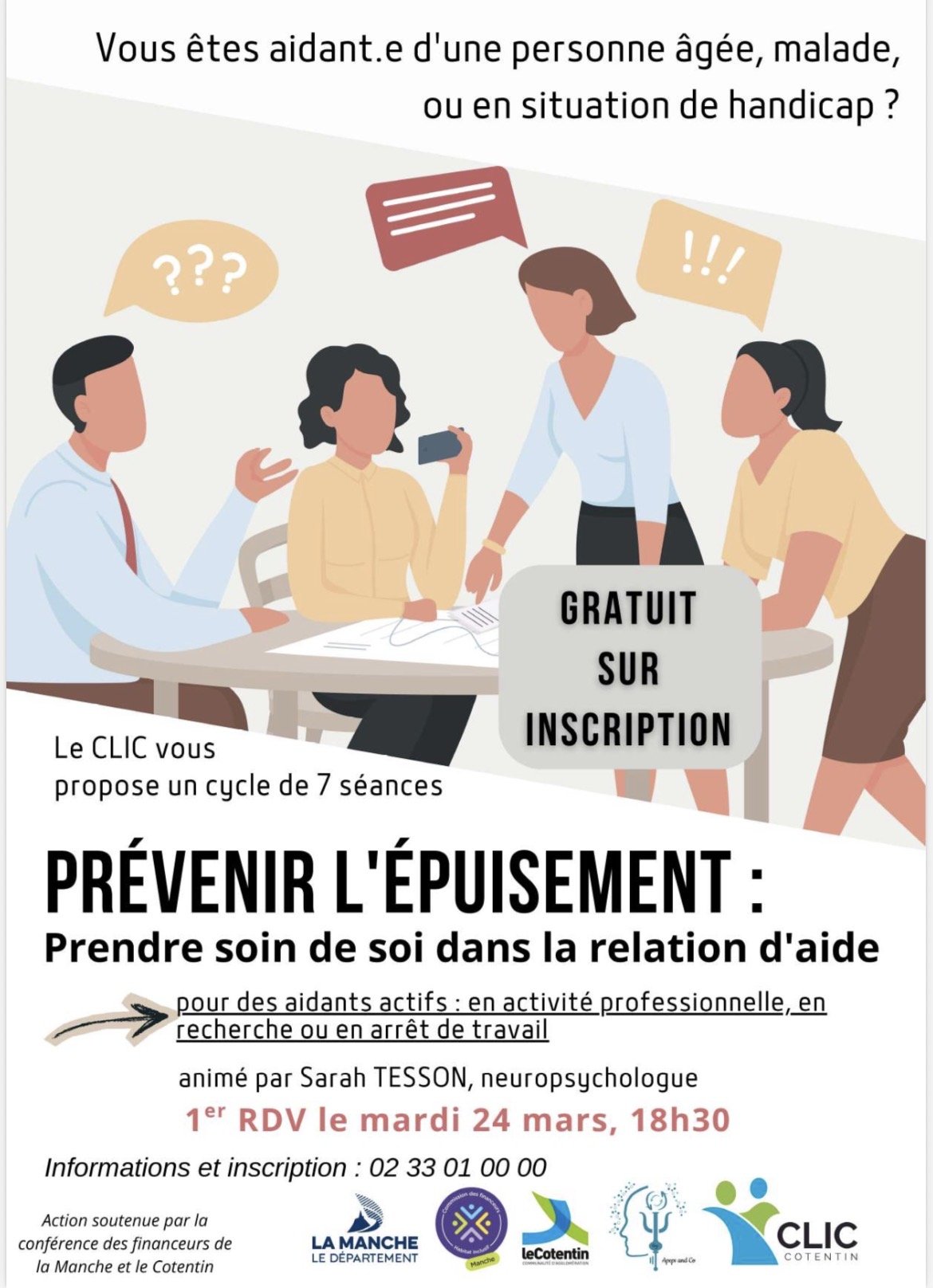 ·« Prévenir l’épuisement : prendre soin de soi dans la relation d’aide » formation proposée par le CLIC et animée par une neuropsychologue sur 7 séances, à partir du 24 mars, 18h30-20h30, pour les aidants actifs (qui travaillent, qui cherchent du travail ou sont en arrêt). Solution de suppléance possible si besoin, à prévoir à l’inscription. Lieu à définir selon les inscrits.