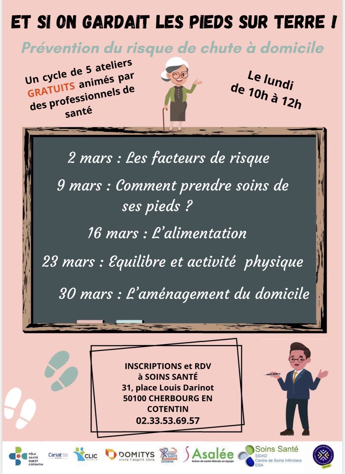 - L’association Soins Santé organise un cycle « prévention des chutes » à partir du lundi 2 mars et tous les lundis jusqu’au 30 mars de 10h à 12h, à Cherbourg-en-Cotentin, dans leurs locaux.
