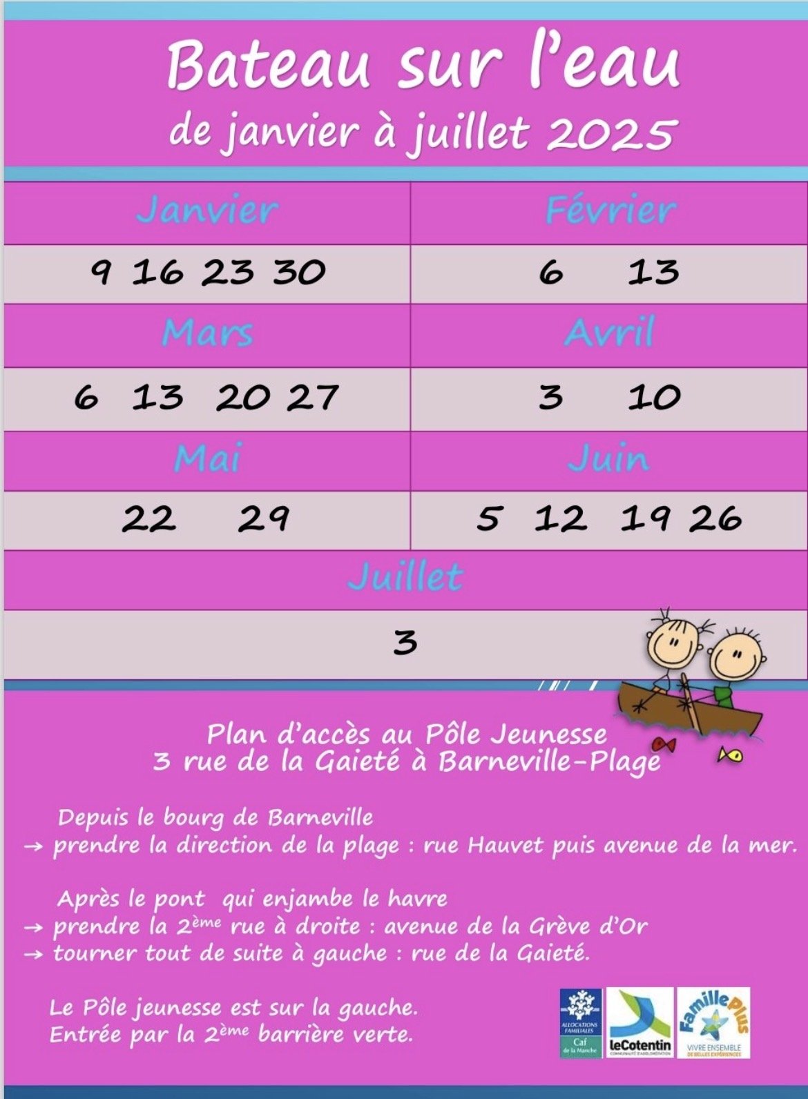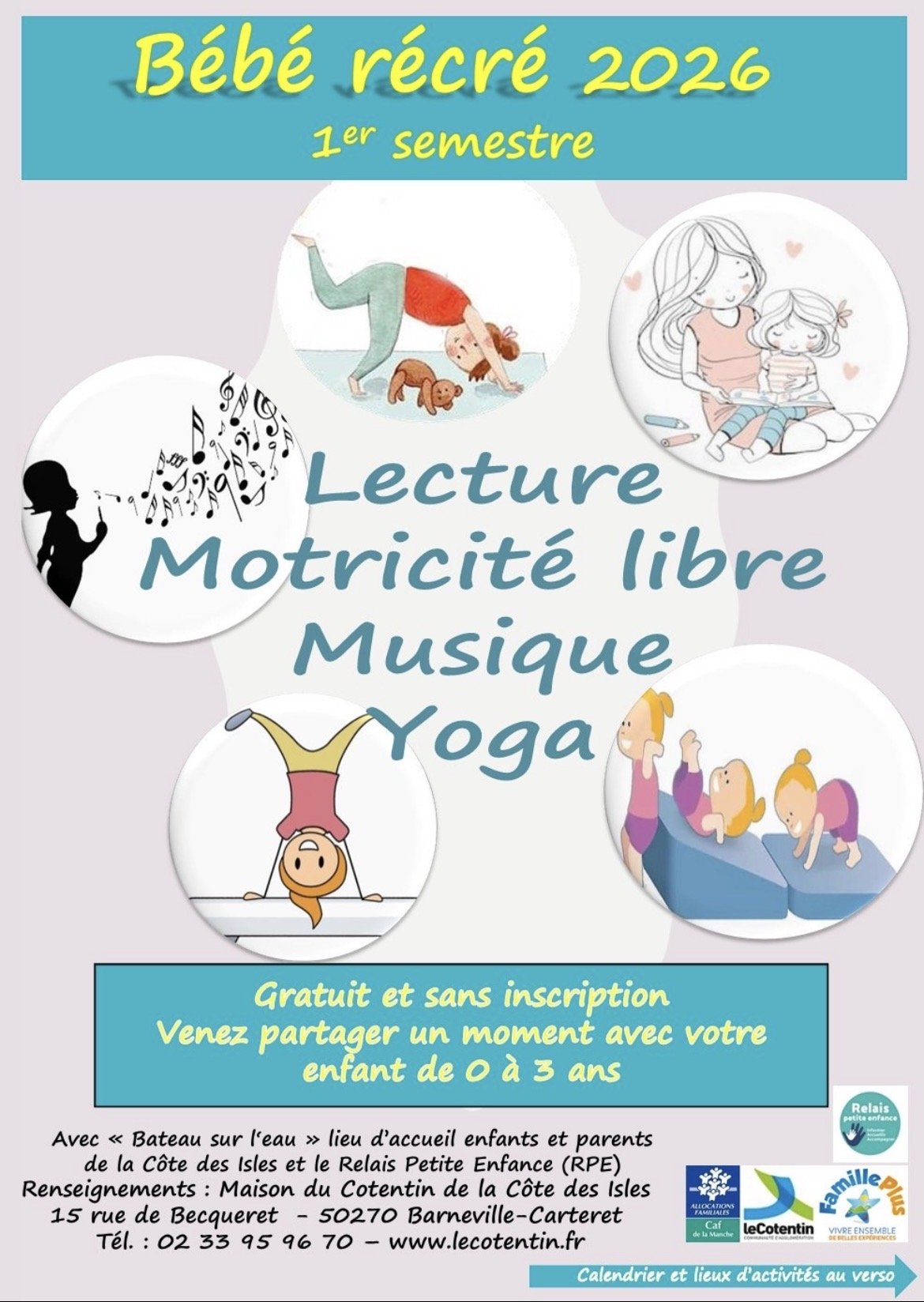 - Bébé yoga à la Maison du Cotentin de la Côte des Isles, le jeudi de 9h30 à 10h00 et de 10h15 à 10h45 – séances encadrées par une animatrice sportive