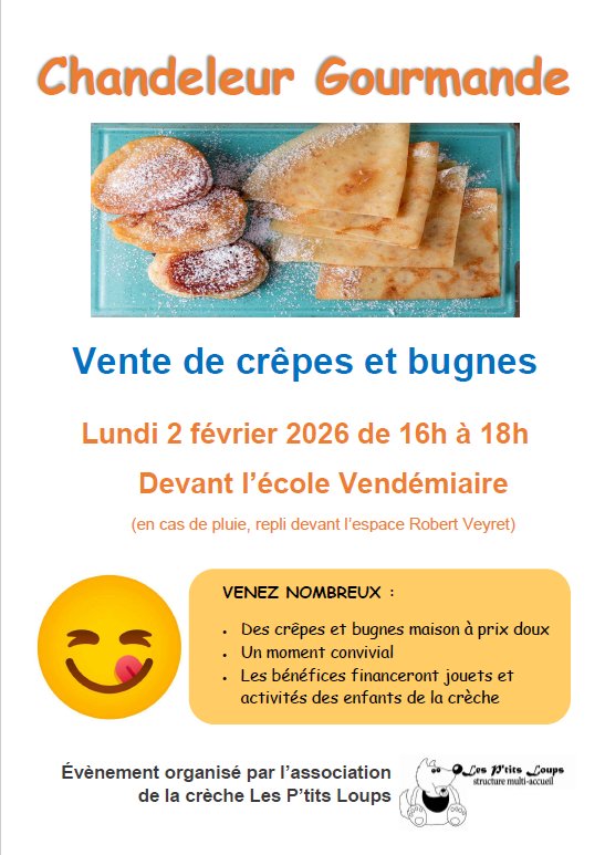 La crèche Les P'tits Loups organise une vente de crêpes et de bugnes lundi 2 février 2026 de 16h à 18h devant l'école Vendémiaire, afin de financer des jouets et des activités pour les enfants de la crèche.