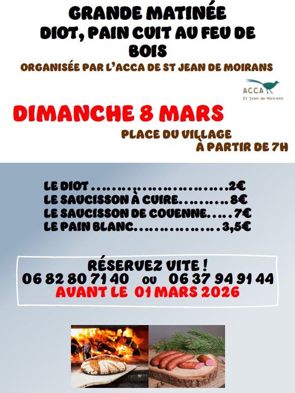 L'ACCA de Saint-Jean de Moirans vous propose une grande matinée diots, pain cuit au feu de bois le dimanche 8 mars 2026 sur la place du village à partir de 7 heures. Pensez à réserver au 06 82 80 71 40 ou au 06 37 94 91 44 avant le 1 mars 2026.