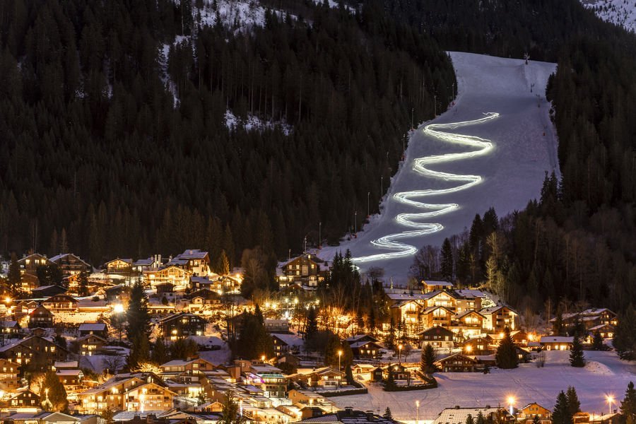 Rendez-vous à la tombée de la nuit pour la traditionnelle descente aux flambeaux des moniteurs de l'ESF. Un spectacle emblématique de la montagne, visible depuis le cœur du village.
