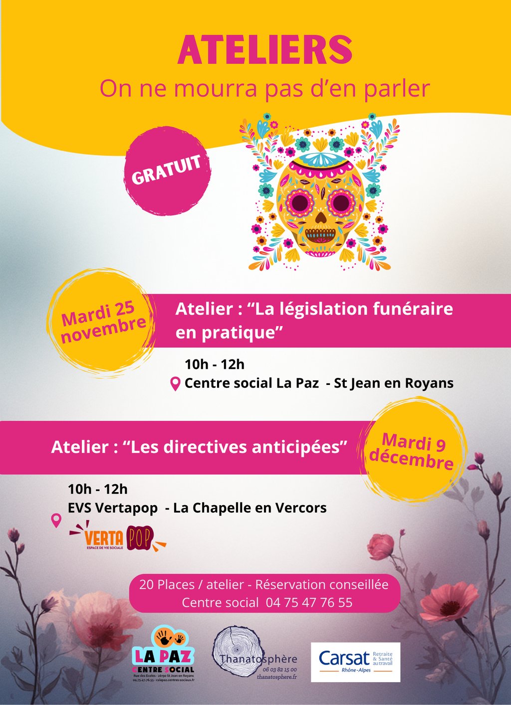 Le Centre Social la Paz, en partenariat avec l’association Thanatosphère, organise 2 ateliers « On ne mourra pas d’en parler » :