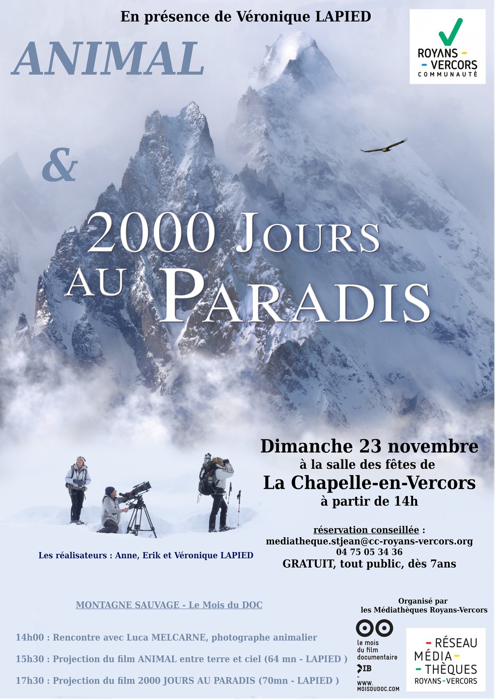 Dans le cadre du « Mois du Film Documentaire », le réseau des médiathèques Royans Vercors organise une projection de 2 films animaliers, de montagne, en présence de la réalisatrice Véronique Lapied.