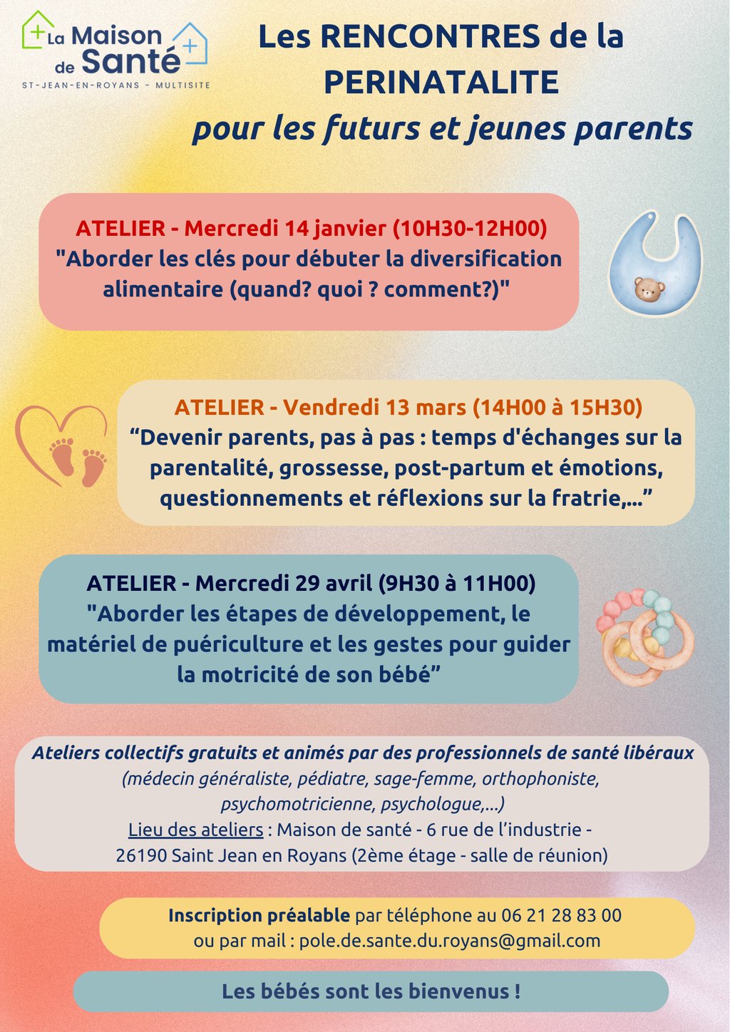 La Maison de Santé Pluriprofessionnelle de Saint-Jean-en-Royans multisite est heureuse de vous présenter le nouveau programme des Rencontres de la Périnatalité pour le 1er trimestre 2026.