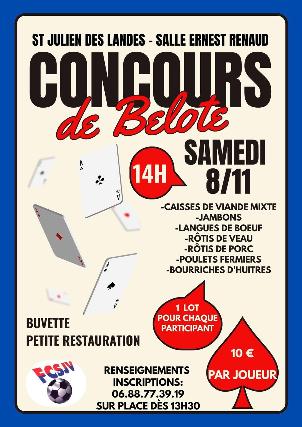 Concours de belote organisé par le FCSJV. Caisses de viande, bourriches d'huîtres, rôtis, poulets, langues de bœuf et nombreux autres lots à gagner. Renseignements et inscriptions au 0688773919