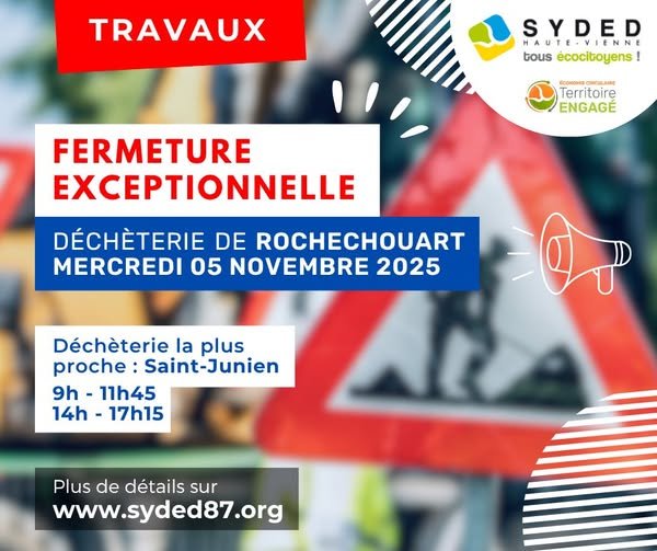 Nous vous informons que la Déchèterie de Rochechouart sera exceptionnellement FERMÉE toute la journée de demain, mercredi 5 novembre 2025.