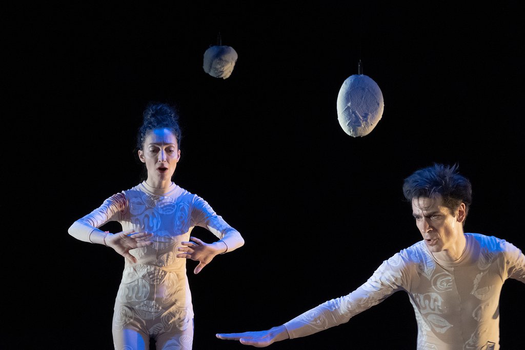 Oh c’est quoi ça ? ou le bonheur de faire sonner les mots. Comme sortis tout droit d’un monde imaginaire, deux personnages en justaucorps jouent avec les sons, les mots, leur corps et le décor. Des langues du monde entier imaginées, la musique des mots chatouille les oreilles. Fait d’onomatopées, d’accentuations, de répétitions, d’ar-ti-cu-la-tions, de rythmes, de vocalise ou encore de chants, ce périple musical et linguistique n’a pas besoin de fil narratif pour raconter de fabuleuses histoires.