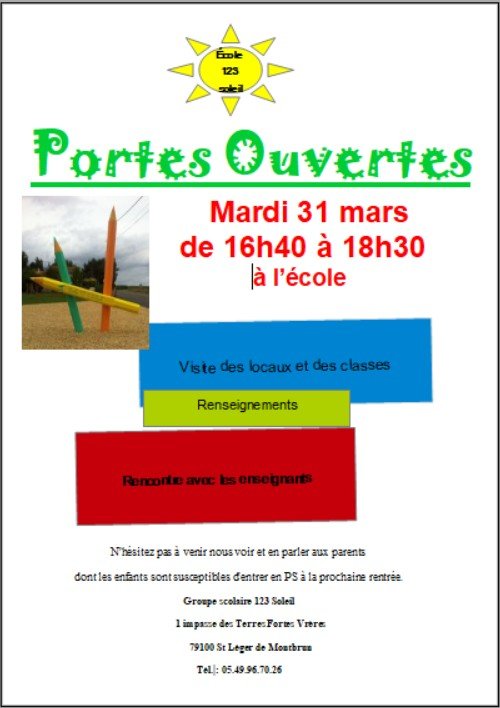 Les Portes Ouvertes de l'école 1, 2, 3 Soleil auront lieu le mardi 31 mars 2026, de 16h40 à 18h30.