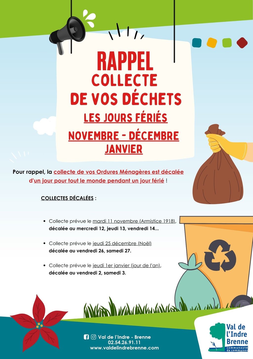 La collecte des ordures ménagères est décalée d'une journée lorsqu'un jour férié tombe dans la semaine.