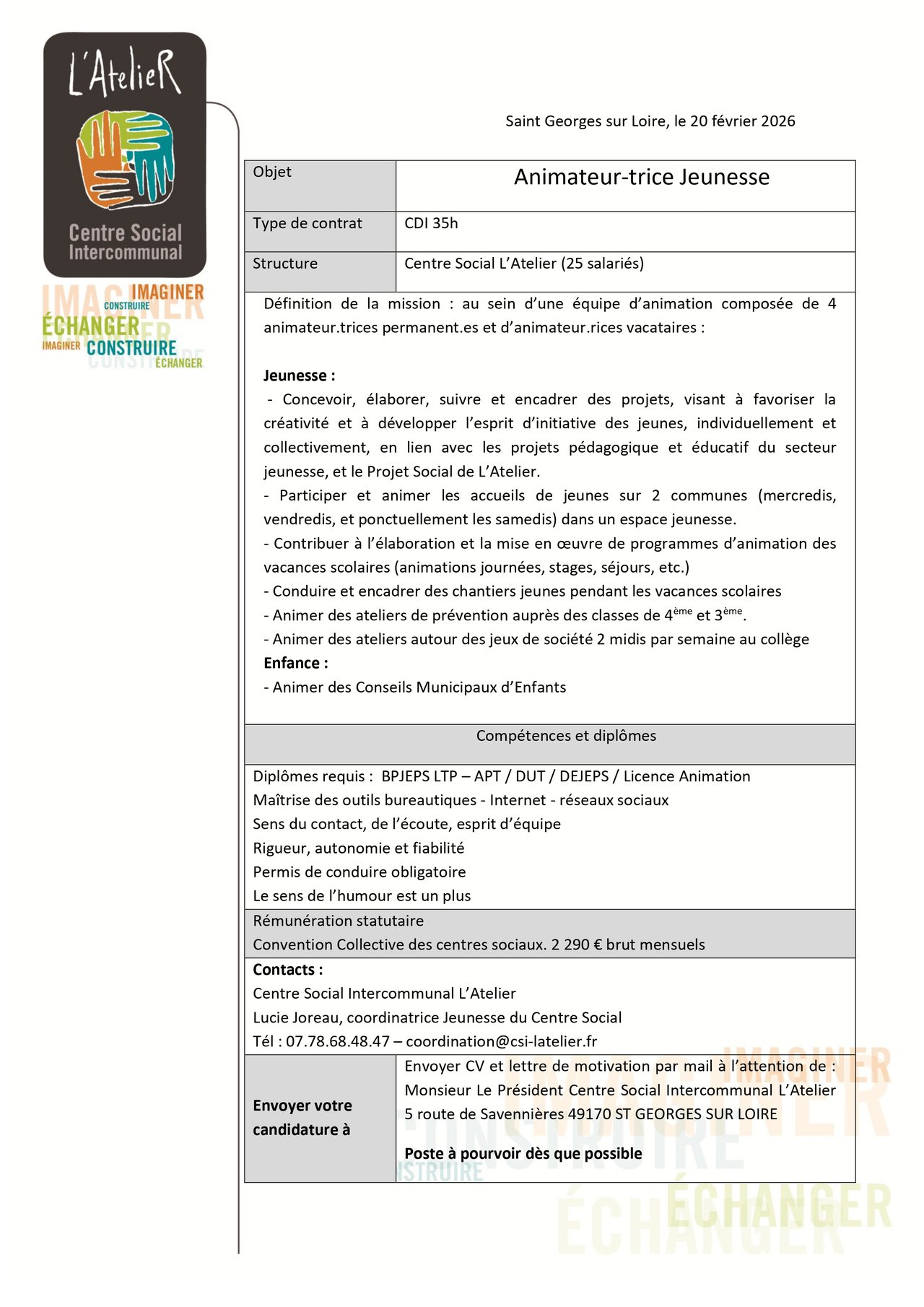 OFFRE D'EMPLOI : ANIMATEUR/ANIMATRICE JEUNESSE