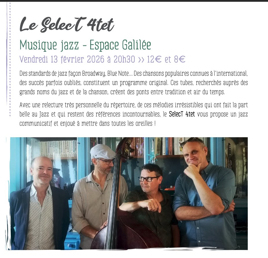 Avec une relecture très personnelle du répertoire, de ces mélodies irrésistibles qui ont fait la part belle au jazz et qui restent des références incontournables, le Select -tet vous propose un jazz. communicatif et enjoué à mettre dans toutes les oreilles
