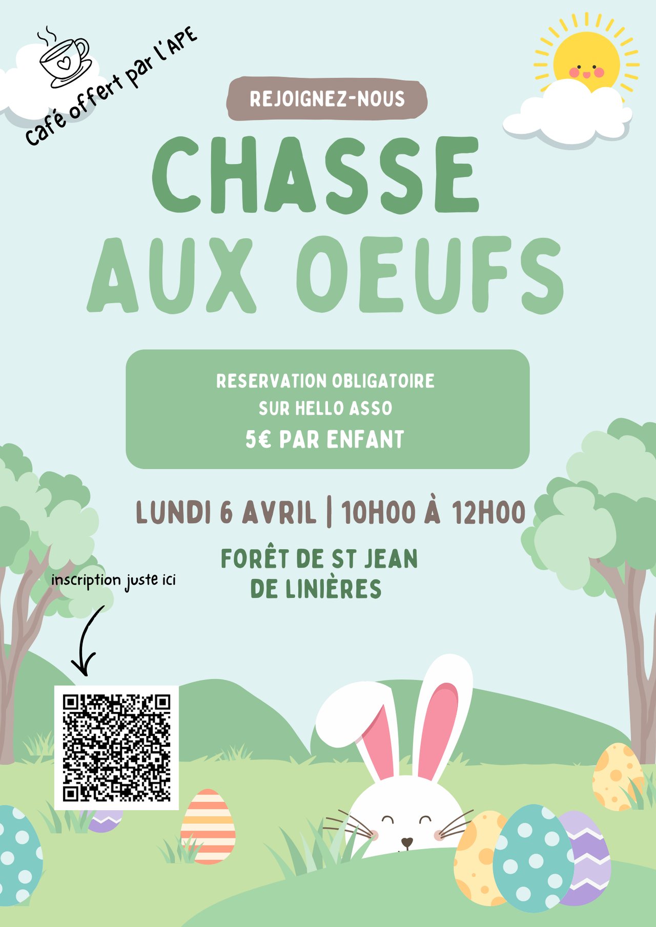 Inscription obligatoire via Hello Asso - chasse aux œufs adaptée aux enfants de moins de 5 ans et aux enfants de plus de 5 ans !
