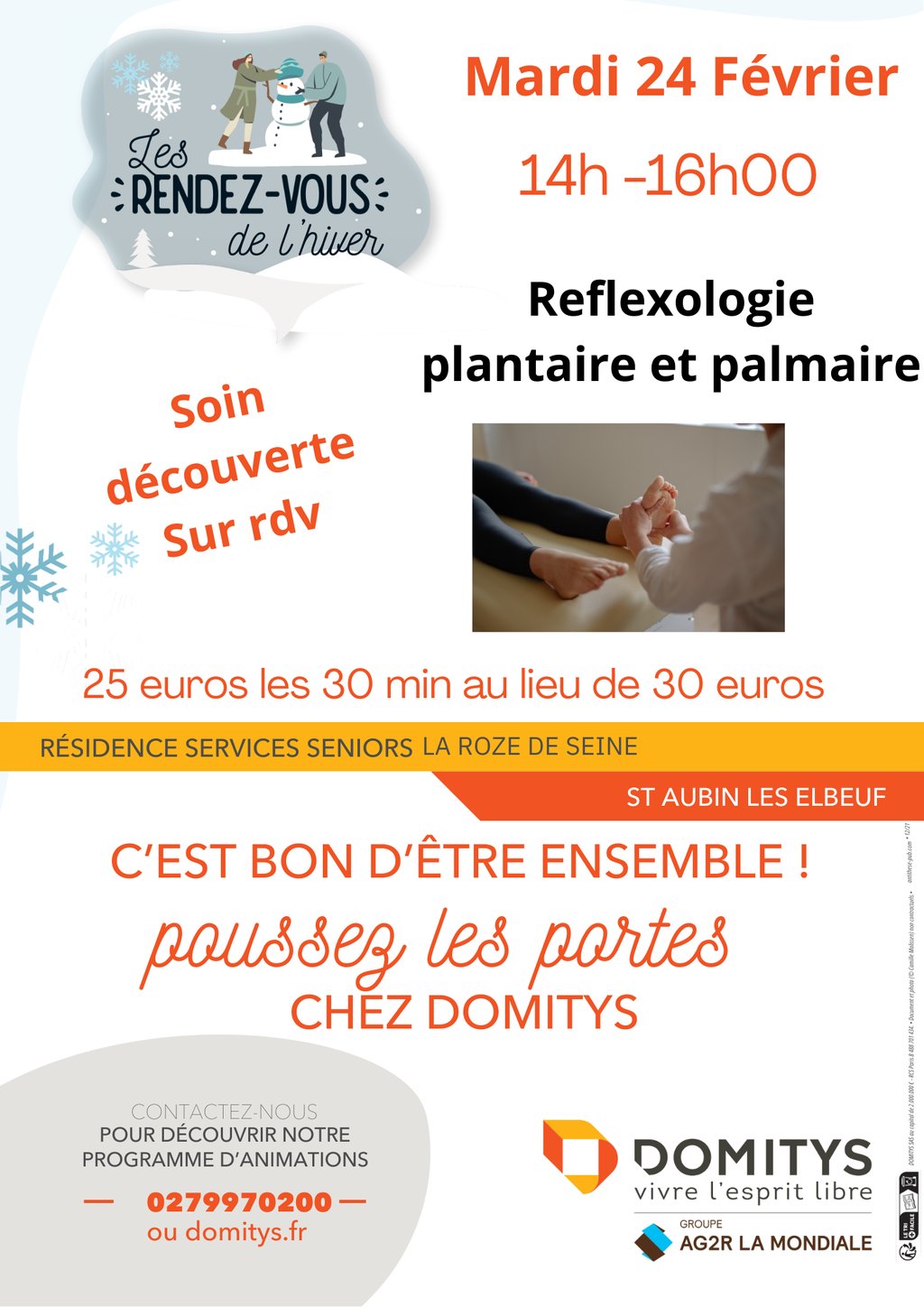 Une réflexologue plantaire et palmaire sera présente le mardi 24 février au sein de la résidence Domitys, pensez à vous inscrire au 02.79.97.02.00 et venez prendre soin de vous !