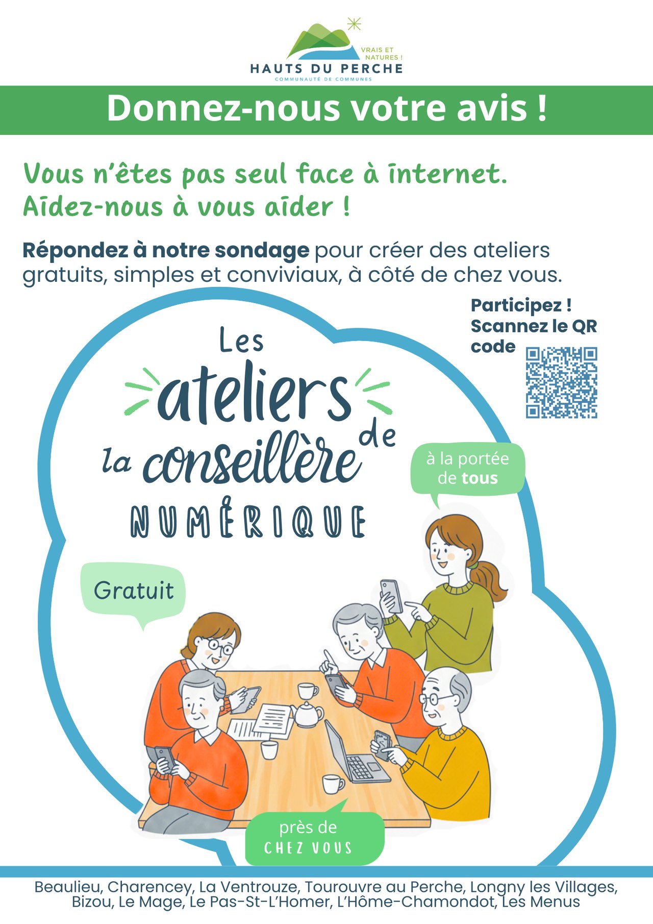 La communauté de communes organise des ateliers gratuits pour vous accompagner dans l'utilisation du numérique au quotidien. Pour mieux répondre à vos besoins, nous aimerions connaître ce qui vous préoccupe. Ce sondage ne prend qu'1 minute !