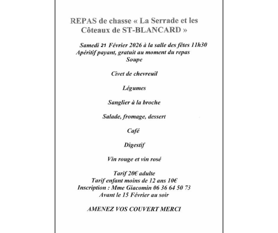 L'association de la Serrade et des Coteaux de St-Blancard propose un repas de chasse.