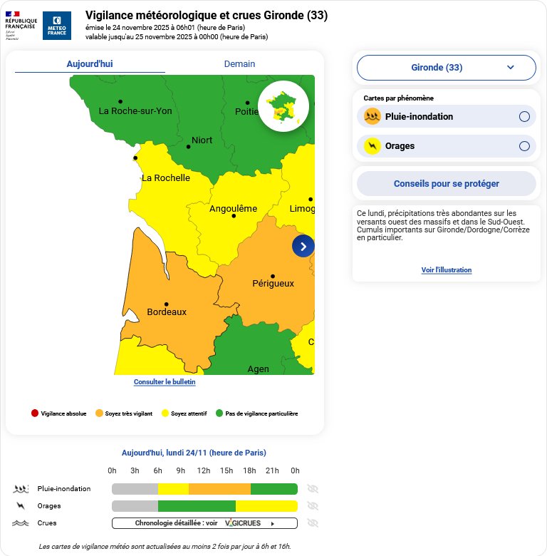 ⚠️ Passage en vigilance orange pluie inondation de la Gironde (33), de la Dordogne (24) et de la Corrèze (19) avec un début d'événement à 10h ce lundi matin. Soyez prudents. Plus d'infos sur : vigicrues.gouv.fr