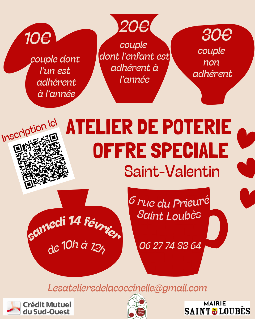 Inscriptions et renseignements : 06 27 74 33 64, lesateliersdelacoccinelle@gmail.com, ou https://www.helloasso.com/associations/les-ateliers-de-la-coccinelle/evenements/offre-speciale-st-valentin
