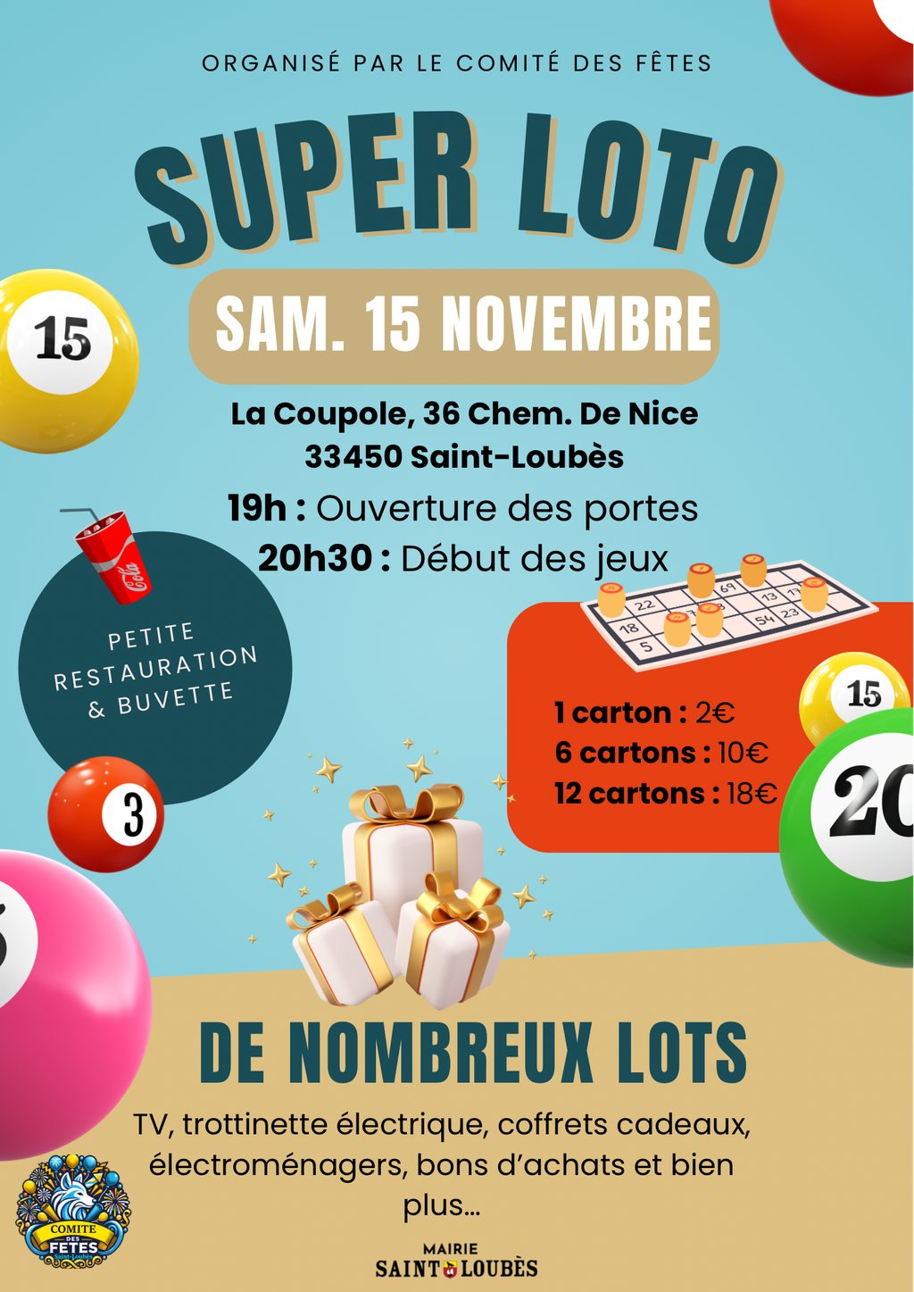 ➡ Le Comité des Fêtes de Saint-Loubès organise un Super Loto le samedi 15 novembre à la Coupole.