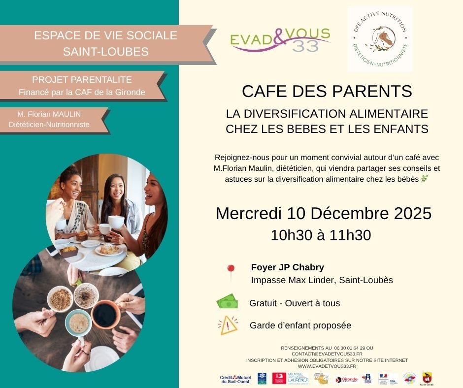 ℹ️ Ouvert à tous. Inscription obligatoire sur : https://www.helloasso.com/associations/evadetvous33/evenements/cafe-des-parents-diversification-alimentaire-bebe-mercredi-10-decembre-2025