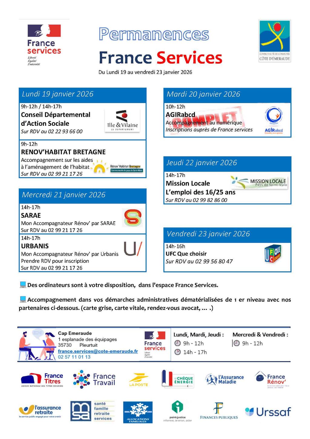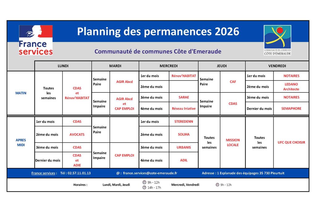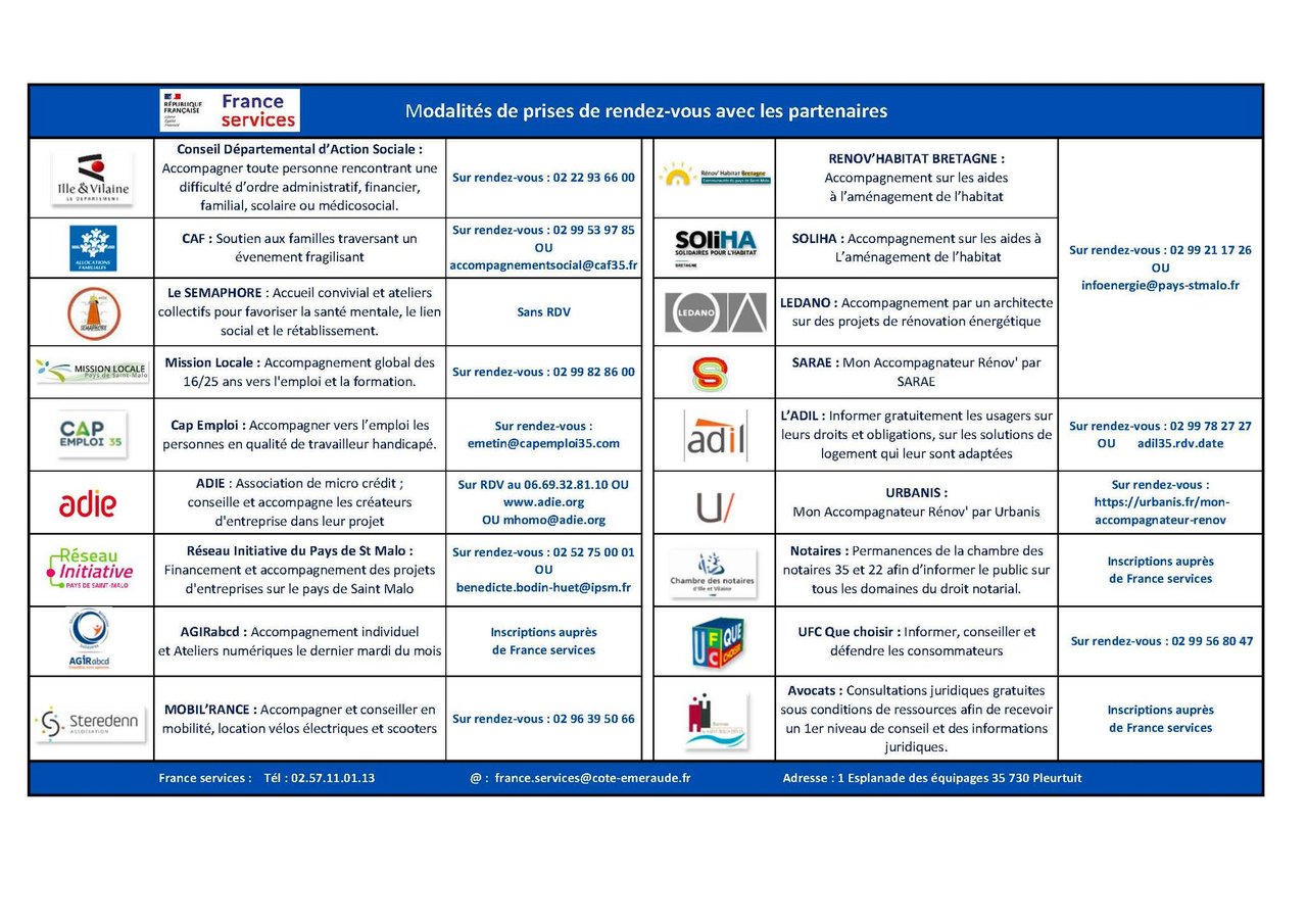 France Services est un service de proximité qui a pour vocation d'aider les administrés dans leurs démarches administratives. Il est situé au siège de la Communauté de Communes Côte d'Emeraude à Pleurtuit.
