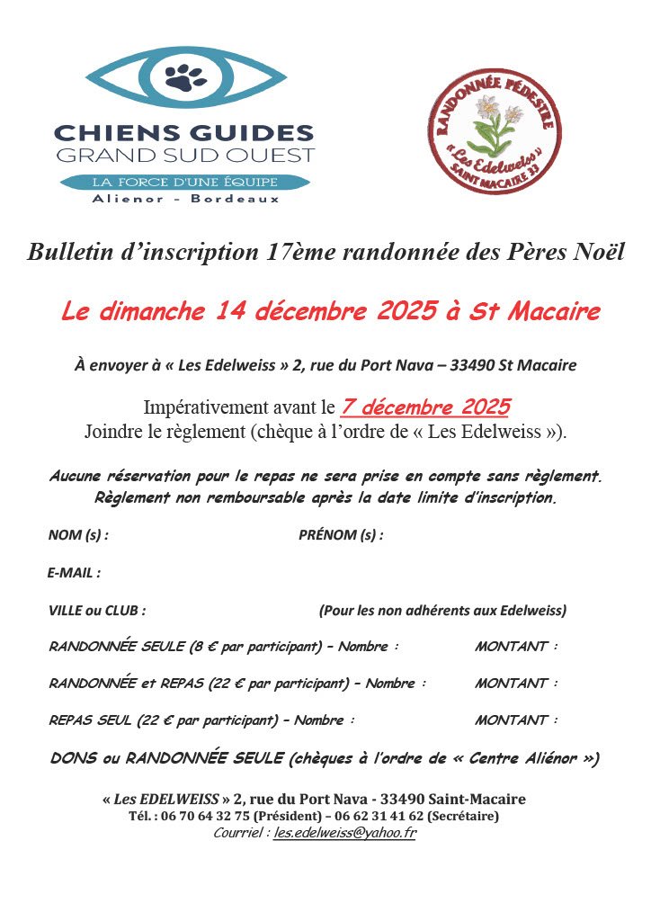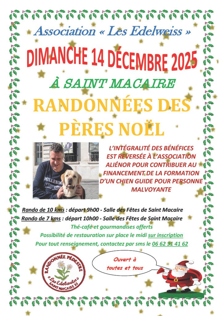 La randonnée des Pères Noël aura lieu cette année le dimanche 14 décembre 2025, départ de la salle des fêtes de St Macaire.