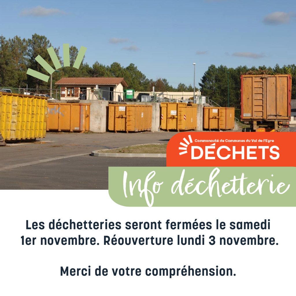 Les déchetteries du Val de l'Eyre seront fermées le samedi 1er novembre. Réouverture lundi 3 novembre. Merci de votre compréhension.