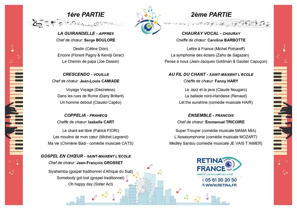 Au programme : Chorales La GUIRANDELLE, CRESCENDO, COPPELIA, GOSPEL EN CHOEUR, CHAURAY VOCAL, AU FIL DES CHANTS, ENSEMBLE.