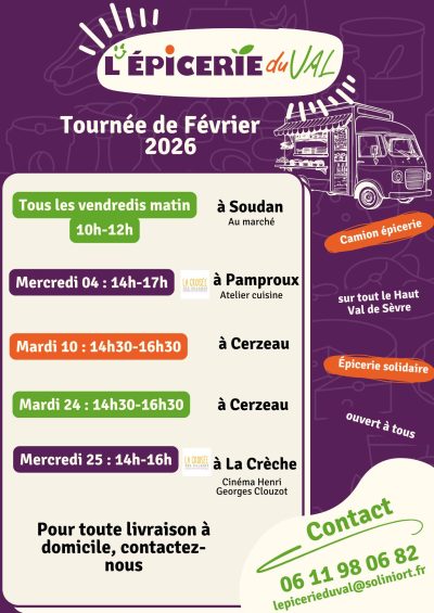 L’épicerie du Val est un projet de solidarité alimentaire sur le Haut Val de Sèvre. Deux points de vente sont ouverts depuis le 24 septembre 2024 : un camion épicerie pour approvisionner les personnes isolées sur le territoire, et un magasin à Saint-Maixent-L’École. Notre objectif est de permettre un accès digne et durable à une alimentation de qualité pour tous. L’impact de l’alimentation sur la santé, la biodiversité, le climat ou la société en général est déterminant. Toutes les équipes de l’épicerie du Val s’attachent à faire vivre les quatre valeurs fortes qui structurent le projet.