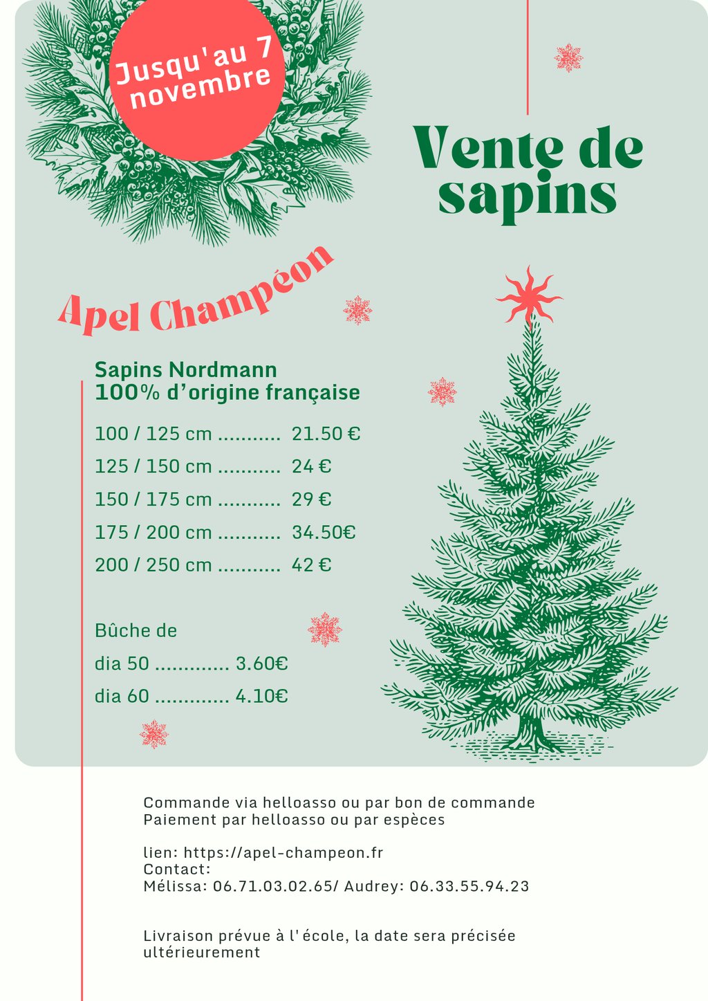 L'APEL de l'école de Champéon, propose une vente de sapins de Noël. Changement de fournisseur, celui de l'année dernière ne propose plus de vente. Renseignements possibles auprès de Mélissa : 06.71.03.02.65 ou Audrey : 06.33.55.94.23