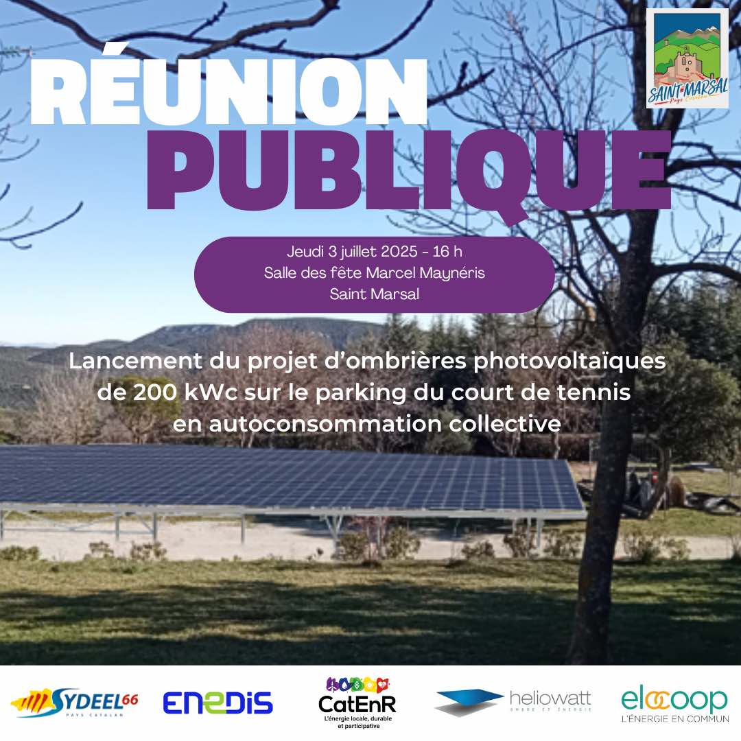 La municipalité de Saint Marsal a décidé de prendre part au développement des énergies renouvelables. Le SYDEEL qui accompagne des communes sur ce sujet a été sollicité et a montré la faisabilité d'un projet d'ombrières photovoltaïques sur le parking 2 (actuelle aire de camping cars). Dans le cadre de cet accompagnement, ce sont les entreprises CaTENR et HelioWatt qui ont finalisé le projet et qui viendront en présenter les détails lors de cette réunion publique.