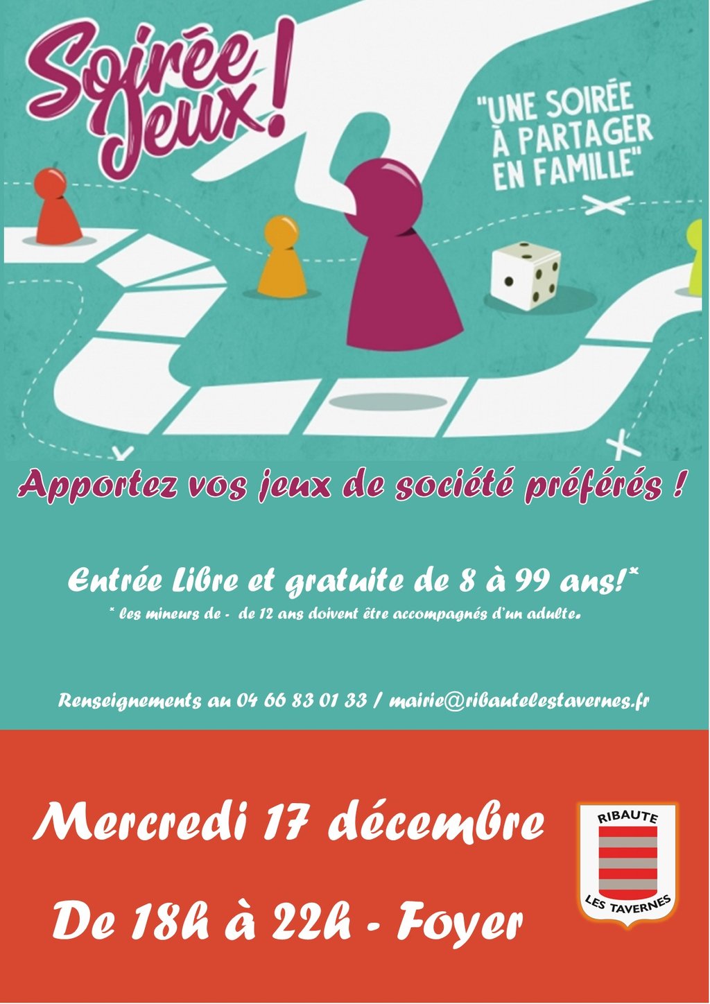 La Municipalité organise une soirée jeux de société le mercredi 17 décembre prochain. Nous vous donnons rendez-vous à partir de 18h au foyer (130 rue du 8 mai 1945). L'entrée est libre et ouverte aux personnes de huit ans et plus. Les mineurs de moins de 12 ans devront être accompagnés par un adulte.