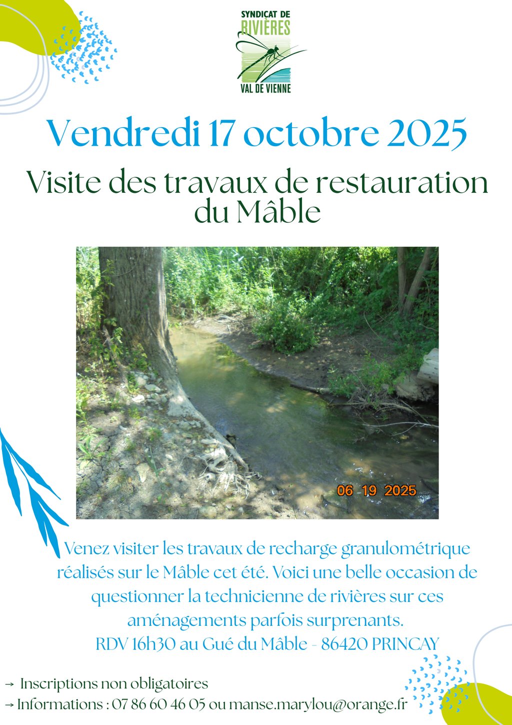 Le Syndicat organise une visite des travaux de restauration du Mâble, réalisés cet été sur 1200 mètres à Prinçay (CC Pays Loudunais) et Sérigny (CA Grand Châtellerault).