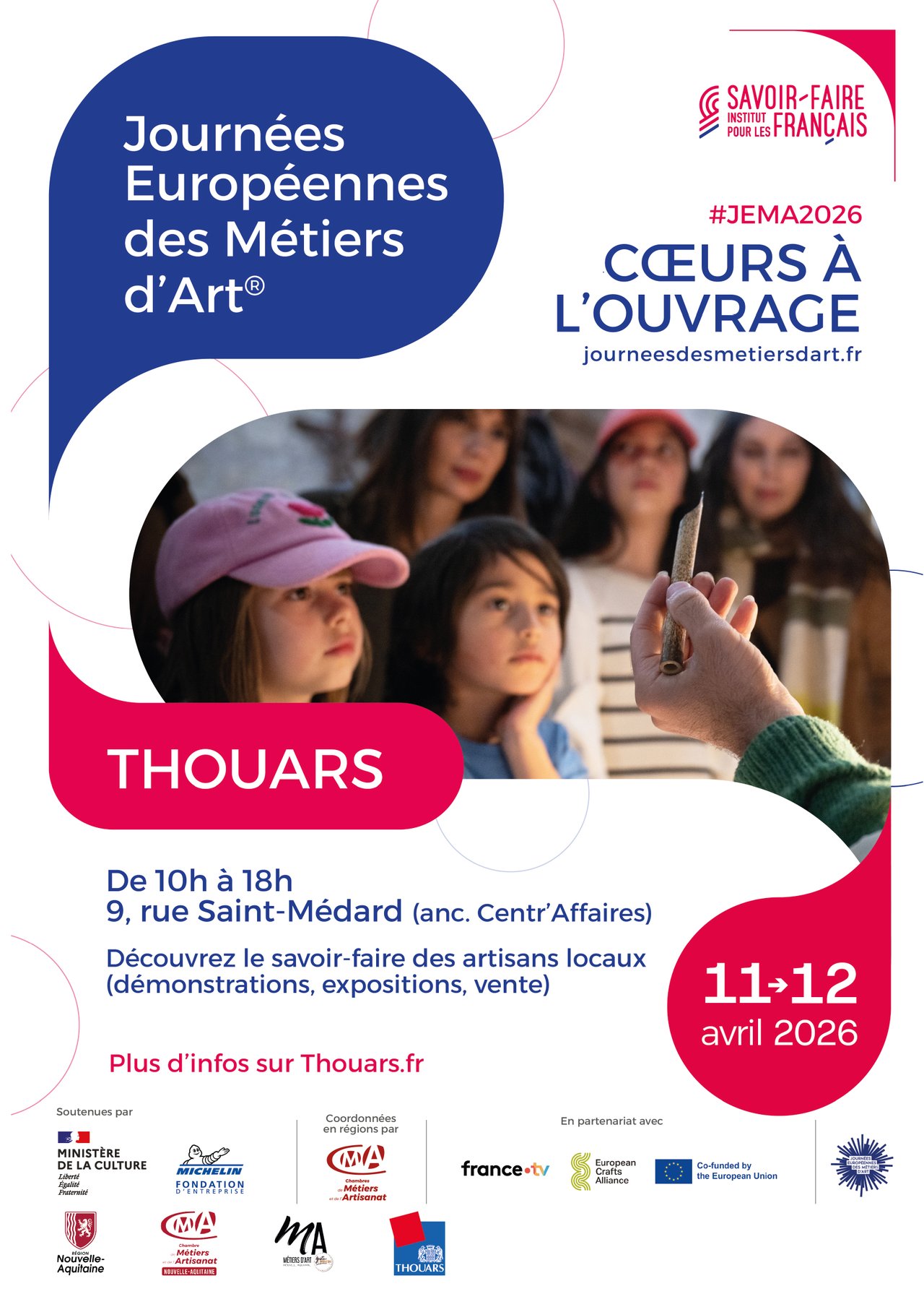 Les 11 et 12 avril 2026, la ville de Thouars accueille pour la première fois les Journées Européennes des Métiers d’Art (JEMA), un événement dédié à la mise en valeur du savoir-faire artisanal et de la créativité locale. Sous le thème national « Cœurs à l’ouvrage », une dizaine d’artisans passionnés partageront leur expertise avec le public, offrant une immersion dans des métiers parfois peu connus, mais essentiels à la préservation du patrimoine artisanal.