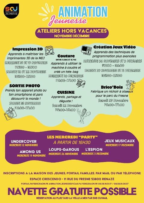 La Maison des Jeunes propose plusieurs ateliers et animations hors vacances permettant aux jeunes de découvrir, créer et partager des moments conviviaux.