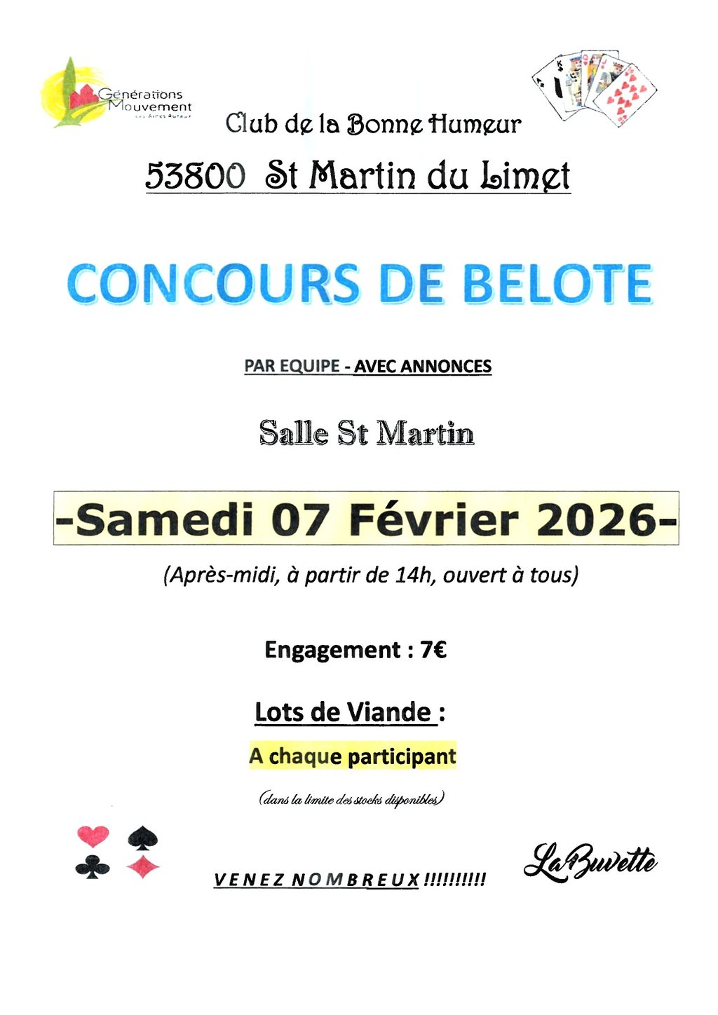 Le Club de la Bonne Humeur organise son concours de belote le 7 février 2026.