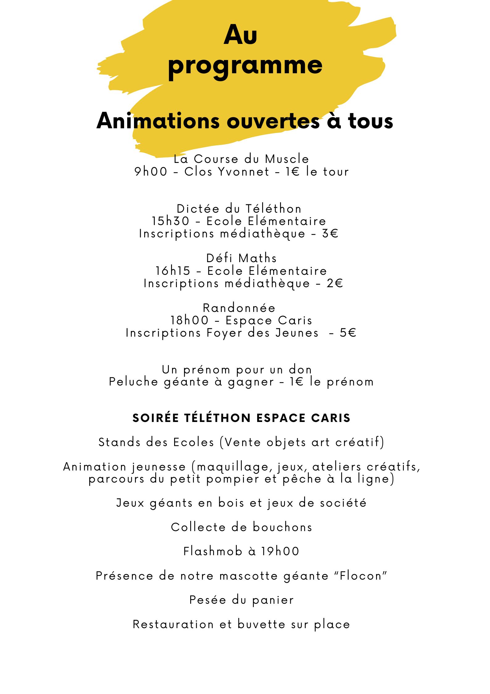 Différentes possibilités de participation (tartiflette à réserver, course du muscle, peluche géante à gagner, dictée, randonnée...)