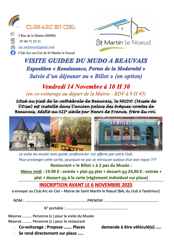 Prochaine sortie ; visite commentée au MUDO le 14 novembre, déplacement en co-voiturage et repas au Billot sur inscription