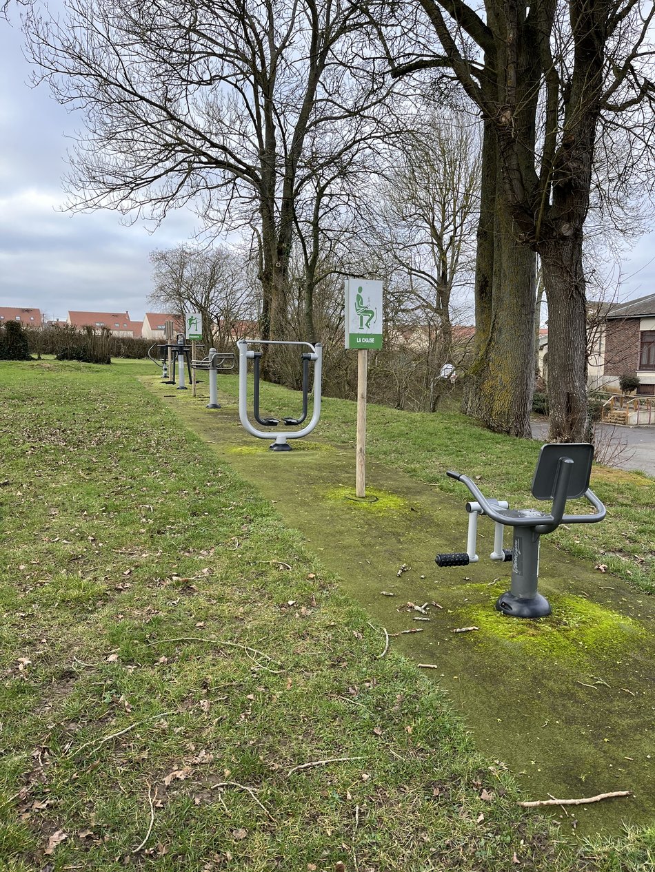 Un parcours d'agrès en libre service, les enfants doivent être accompagnés. Les agrès, rappelons-le, sont des appareils, ou des plateformes, que les athlètes utilisent afin de réaliser des mouvements.