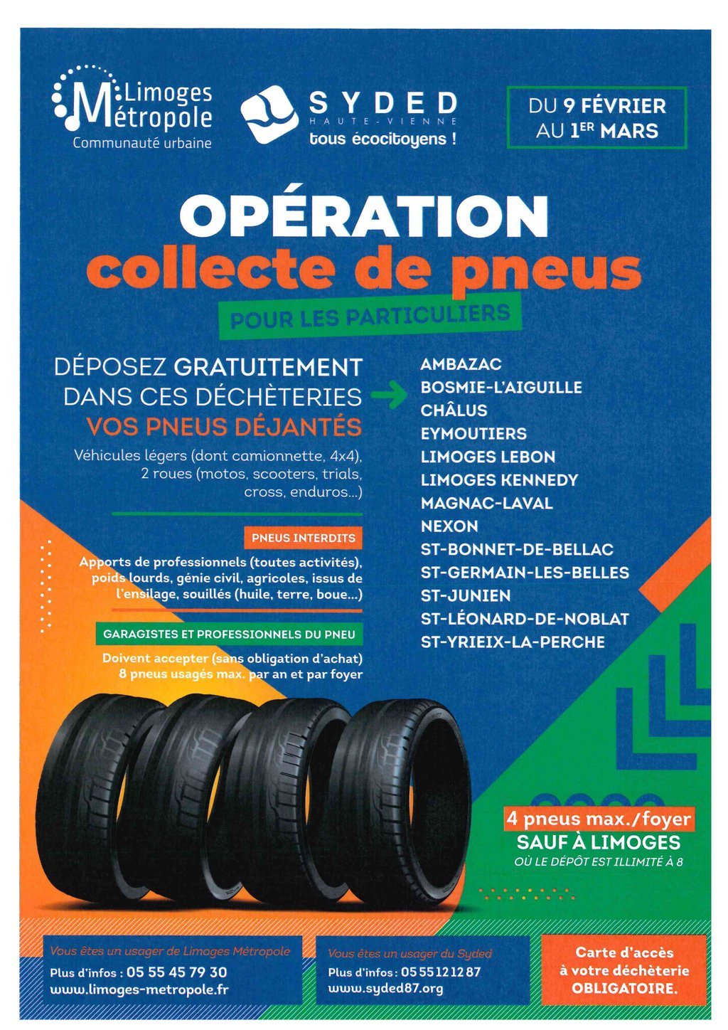Du lundi 9 février au dimanche 1er mars 2026, une collecte de pneus est organisée, réservée aux particuliers, pour lutter contre les dépôts sauvages. Cette initiative offre la possibilité aux habitants du département de déposer leurs pneus usagés dans une filière de valorisation conforme à la règlementation.