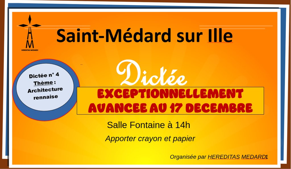 La dernière dictée de l'année aura exceptionnellement lieu ce mercredi 17 décembre à 14h à la salle JJ Fontaine.