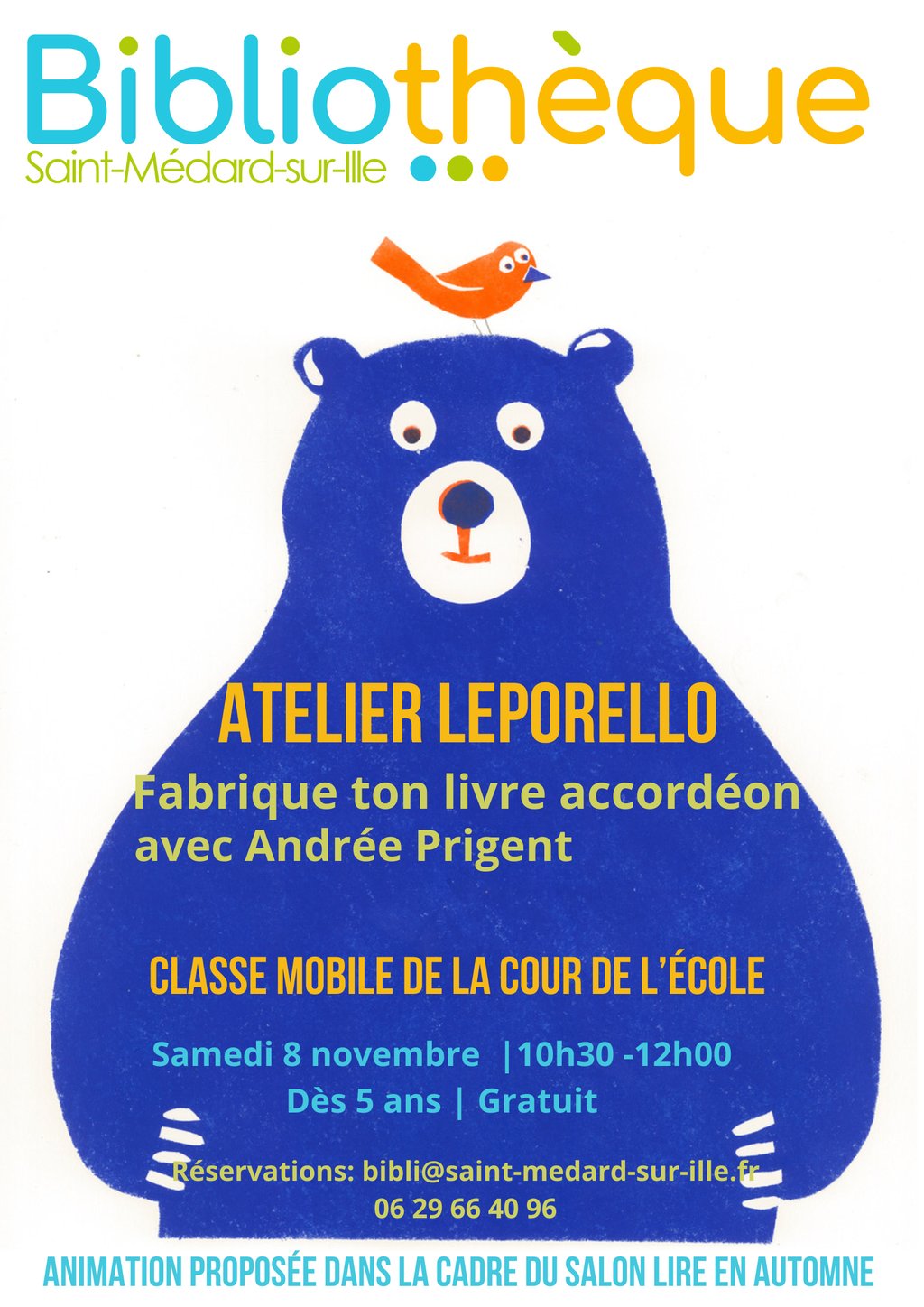 Un Atelier leporello est proposé et animé par l'autrice et illustratrice Andrée Prigent samedi 8 novembre de 10h30 à 12h00 à la biliothèque de saint Médard sur ille.