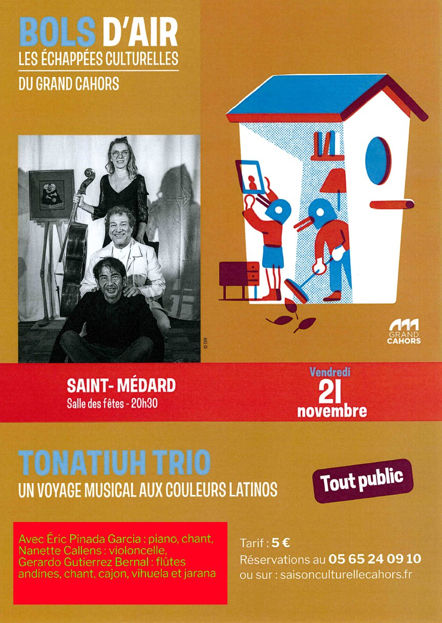 Dans le cadre des manifestations "Bol d'Air - Les échappées culturelles du Grand Cahors", la salle des fêtes de Saint-Médard accueillera le vendredi 21 novembre à 20h30, pour un concert festif et haut en couleurs, le groupe mexicain TONATUIH TRIO.